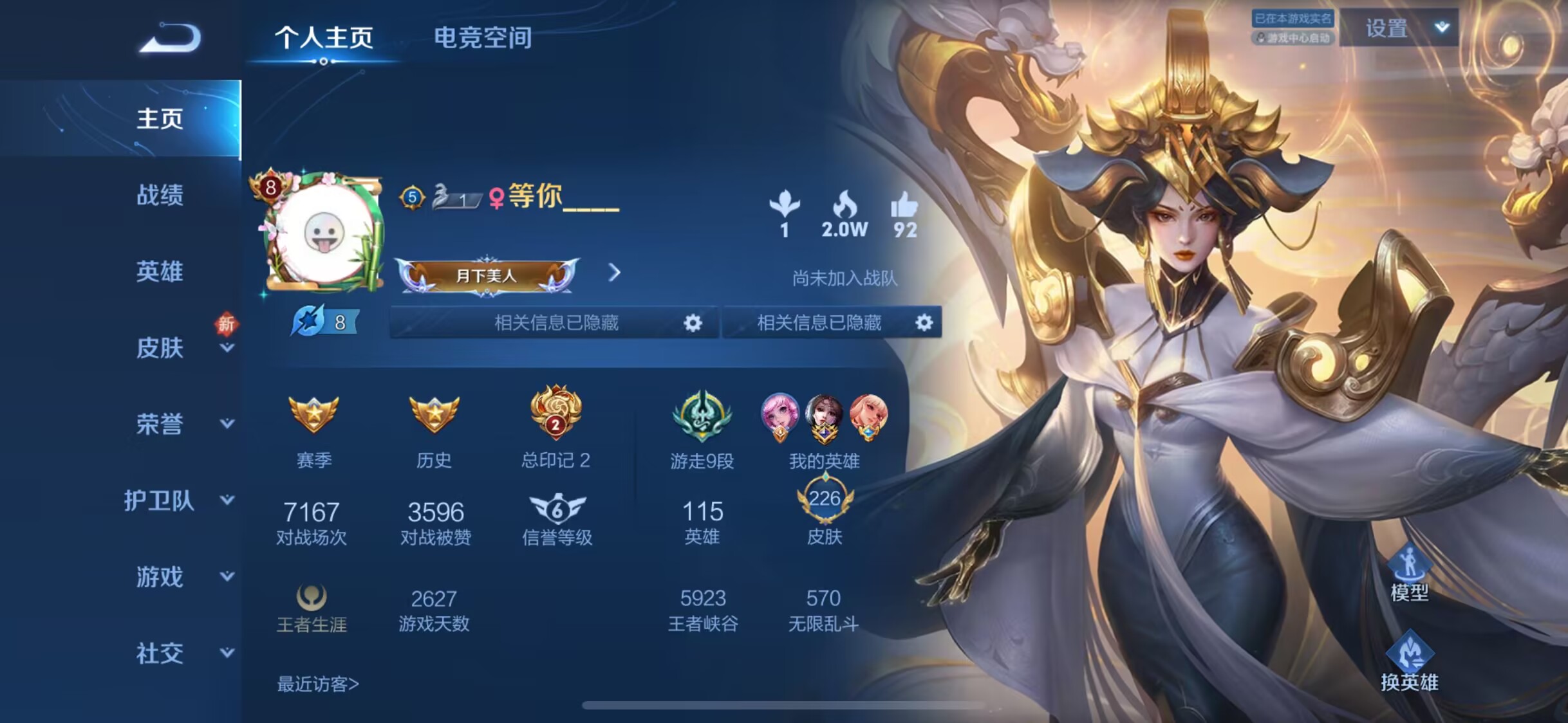 适配系统:苹果 角色名:等你 信誉分:93 账号类型(腾讯):QQ 排位赛:允许 段位:荣耀王者 巅峰赛:允许 英雄个数:127 皮肤个数:288 营地ID:646080193 分销起租时长:2 VIP等级:8 是否禁言:否
