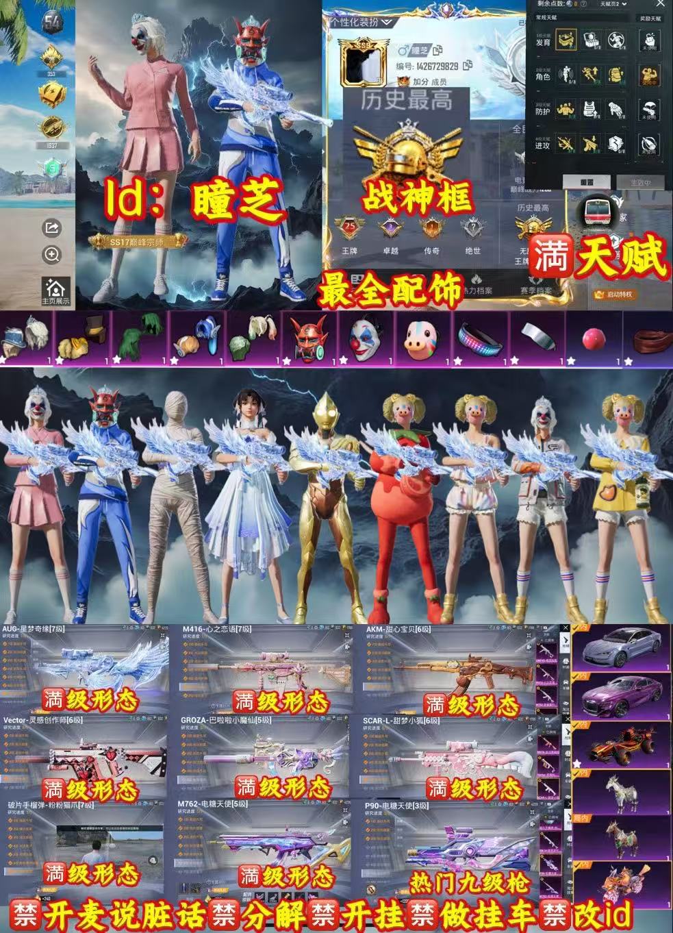 适配系统:苹果 账号类型(腾讯):微信 分销起租时长:1 载具数量:6 粉色时装数:40 套装数量:187 特效枪数量:20 枪皮数量:199