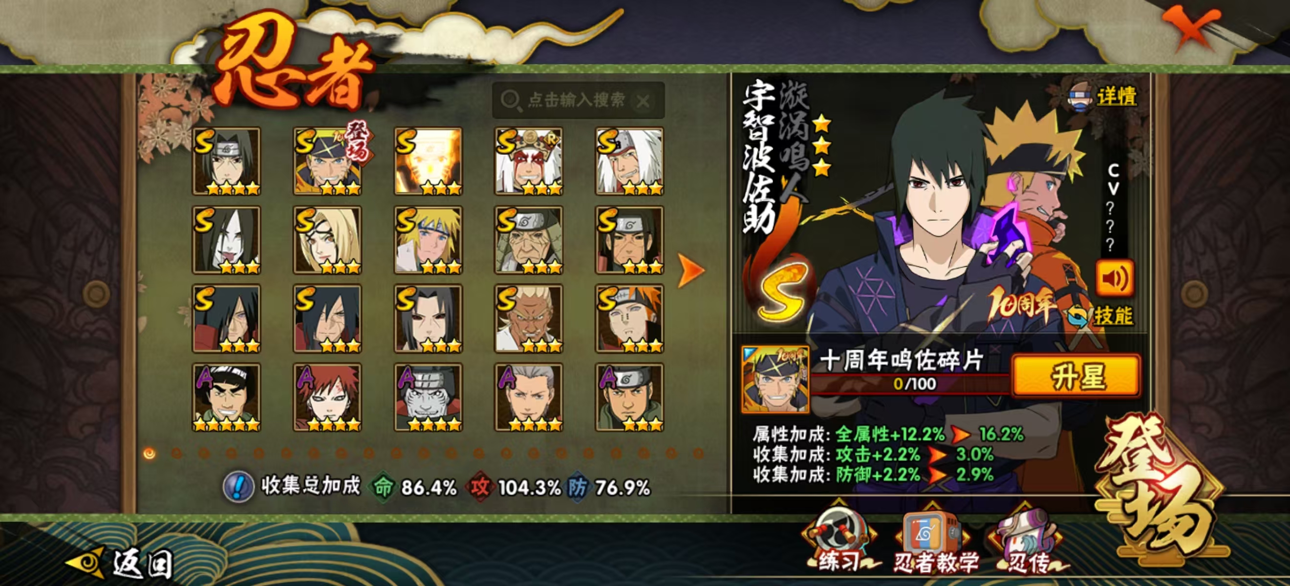 适配系统:安卓 账号类型(腾讯):QQ 分销起租时长:1 战力值:932.3W A忍者数量:34 S级忍者数:15