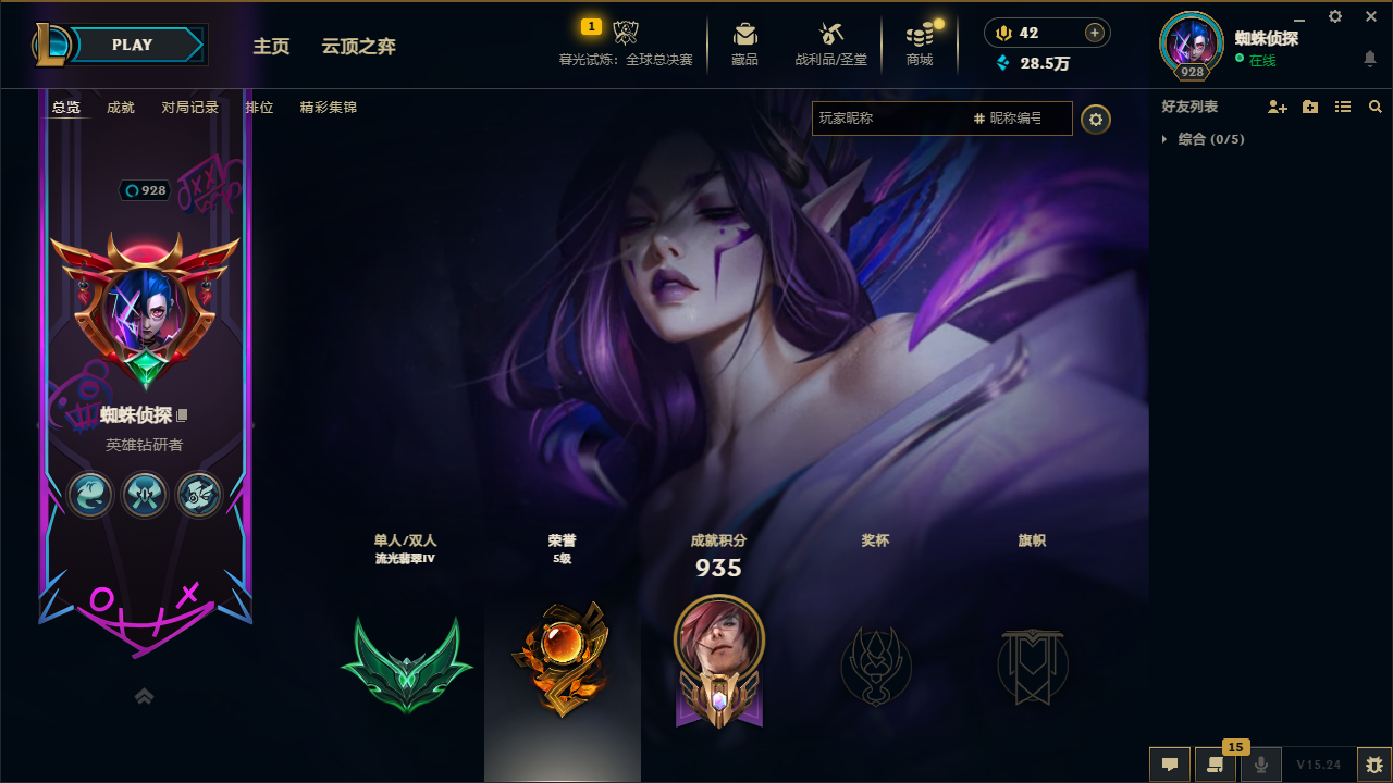 角色等级:933 角色名:蜘蛛侦探 排位赛:允许 单双排段位:流光翡翠IV 灵活组排段位:流光翡翠IV 英雄数量:172 皮肤数量:1550 云顶段位:无段位 双人作战段位:无段位