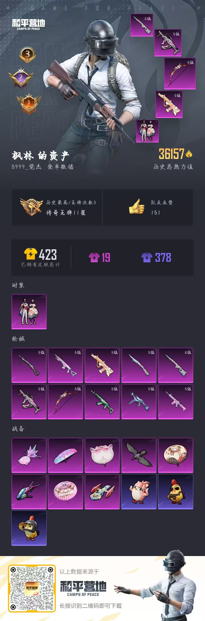 适配系统:安卓 红装数量:0 账号类型(腾讯):微信 分销起租时长:1 载具皮肤:0 粉色时装数:1 套装数量:70 特效枪数量:10 枪皮数量:88