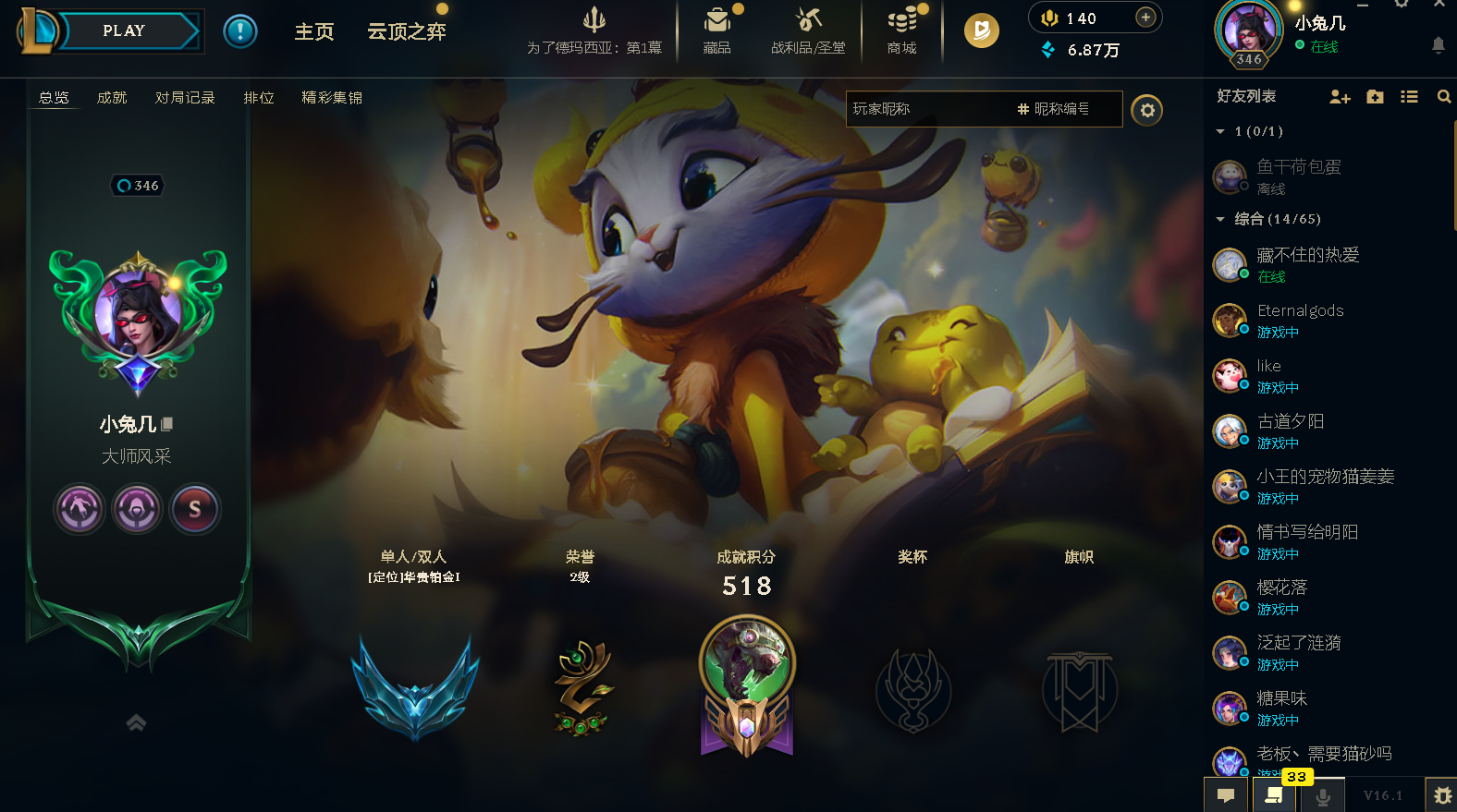 角色等级:347 角色名:小兔几 排位赛:允许 单双排段位:流光翡翠III 灵活组排段位:- 英雄数量:150 皮肤数量:97 分销起租时长:1 云顶段位:无段位 双人作战段位:无段位