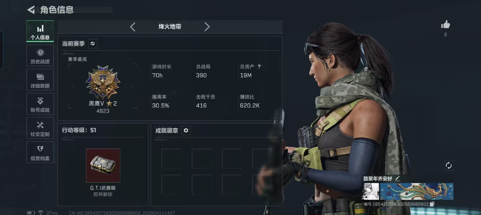 哈夫币比例:18 烽火地带等级:60 全面战场段位:军士长 负重等级:4级 典藏皮肤数:0 哈夫币:13465999 AWM红弹数量:0 载具皮肤数:4 六套装备数量:0 角色名:路景年乔安好 烽火地带段位:黑鹰 干员数:9 体力等级:4级 普通皮肤数:17